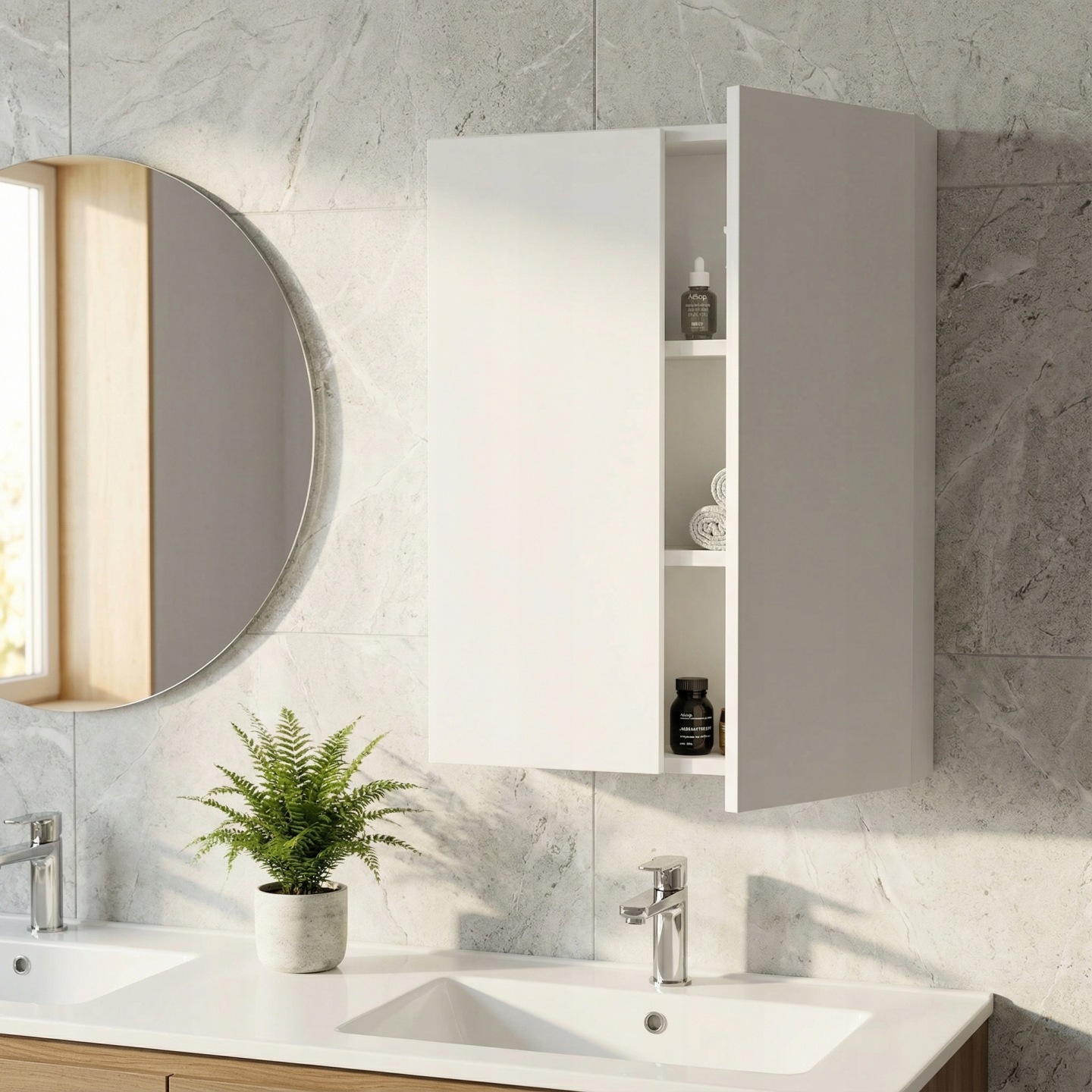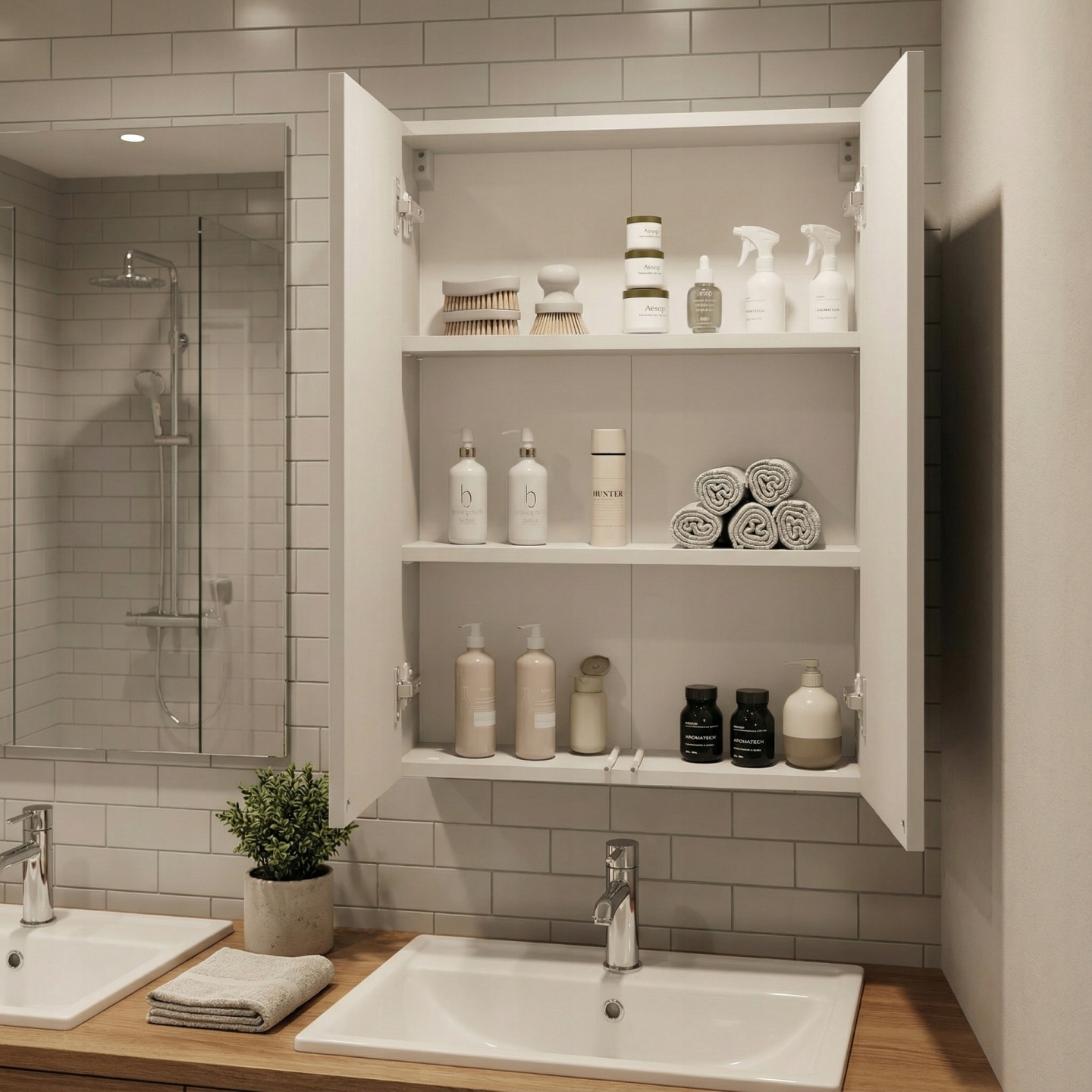 Minimalistyczna forma skrywa praktyczne półki, które pomagają utrzymać idealny porządek w łazience. Środkowa przestrzeń ekspozycyjna dodaje lekkości i umożliwia szybki dostęp do codziennych akcesoriów ✨📦