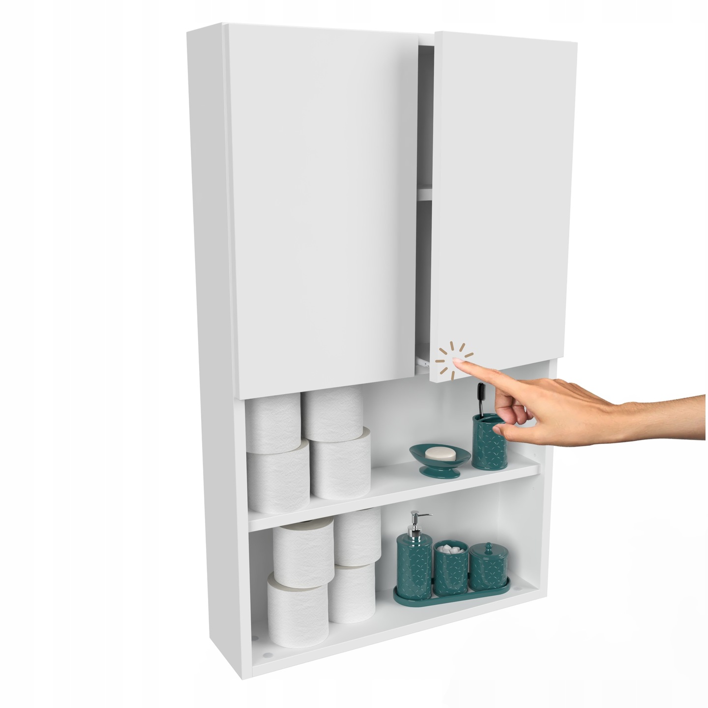 Praktyczny układ półek umożliwia uporządkowanie kosmetyków i akcesoriów w jednym miejscu. Zamykane fronty i otwarta część gwarantują komfort użytkowania na co dzień 👌