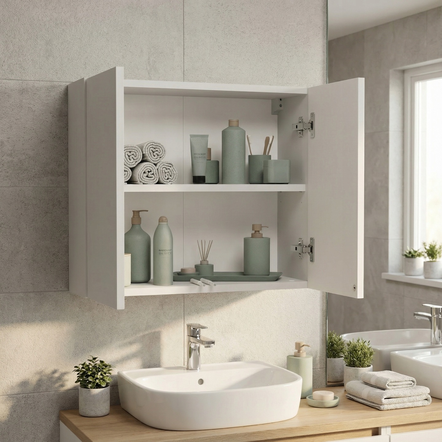 Szafka łączy pojemność i niewielkie wymiary, dzięki czemu idealnie sprawdzi się w każdej łazience 🧩. Przemyślane wnętrze umożliwia wygodne przechowywanie najpotrzebniejszych rzeczy 🧴